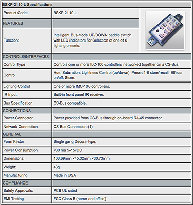 Intelligent Networkable 11- Button Keypad for ILC-100 – Accurate Color Adjustment/Operation Specific chroma keys enable any color from a palette of over 16 million to be quickly selected. Color hue, saturation and lightness can be adjusted to any level (steps &lt; .5%). Specific color settings can be stored on the keypad into six separate preset locations. Those presets can be quickly recalled, adjusted or programmed together into a dynamic LED “show.” Built-in IR receiver and Attractive Decora® Packaging A nearly invisible IR receiver enables any BSKP keypad to be utilized with remote IR transmitters. The entire keypad is seamlessly integrated into an attractive Decora® Packaging which blends with nearly any décor.<br> Enables Seamless Remote Operation. Remote can be programmed to control any number of ILC-100™ controllers residing on the CS-bus. Those CS-Bus compatible controllers can be logically organized in groups with sizes from 1 to over 65,000 (controllers). Any group can be triggered by an IR signal whether within a locally wired zone (limited to 4000 feet) or anymore throughout the world through an optional Ethernet adapter. In addition, for systems which integrate IMC-100 motor controllers, two scene presets can be set to be automatically triggered when a networked motor device is activated. Simple Field Programming Without the Use of a Computer or Other Programming Tools As an alternative to remote programming, a simplified built-in programming scheme permits on-site programming without the need of computers or other programming tools. Simply press a “discovery” button on any motor controller and press and hold a BSKP keypad button to immediately program the linkage between a BSKP keypad and one or more CS-Bus compatible controllers. Easy Mounting with Modular (RJ) connector An integrated modular RJ connector enables quick connection/wiring in the field.