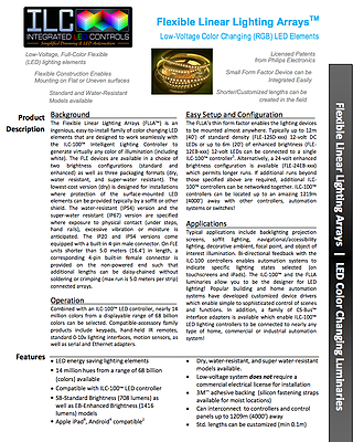 Our Flexible Linear Lighting Arrays (FLLATM) are color changing RGB, RGB+W and Monocromatic LED elements designed to work seamlessly with our ILC-100TM Lighting Controller to generate up to 16.1 million colors including white and dim to an amazing 0.01%.